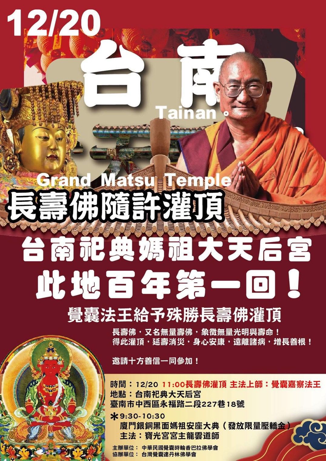 台灣宗教文化交流即將迎來一場極具歷史意義的盛事。藏傳佛教覺囊傳承重要上師—覺囊嘉察法王,將於 2025 年 12 月 20 日 蒞臨台南國定古蹟、官設祭祀廟宇 祀典大天后宮,親自主持殊勝的 「長壽佛灌頂法會」。此舉被視為台南宗教史上罕見的跨宗派、跨文化法緣匯聚,也象徵佛教密法首次於此官廟空間中,正式為大眾廣結長壽與祝福之因緣。