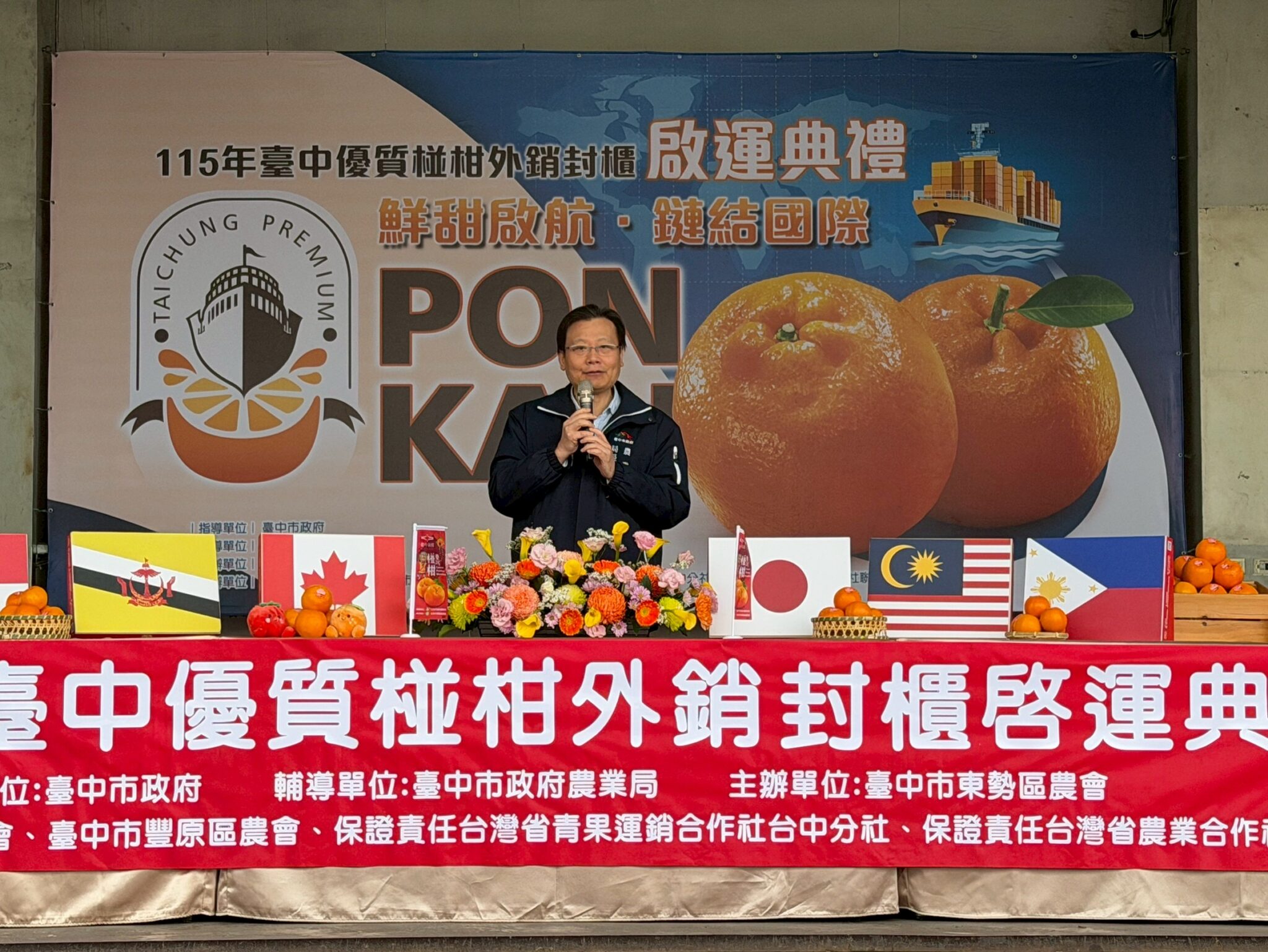 台中市政府農業局持續輔導農民團體拓展農特產品外銷市場,今(12)日於東勢區農會舉辦「115年台中優質椪柑外銷封櫃啟運典禮」,宣告台中椪柑正式啟航、邁向國際。活動邀集產官學界代表共襄盛舉,見證台中優質椪柑在疫後持續深耕海外市場,透過穩定外銷通路提升國際能見度,也為農民創造更佳收益。今年度預計外銷總量達600公噸,銷往新加坡、馬來西亞、汶萊、日本及加拿大等國家。