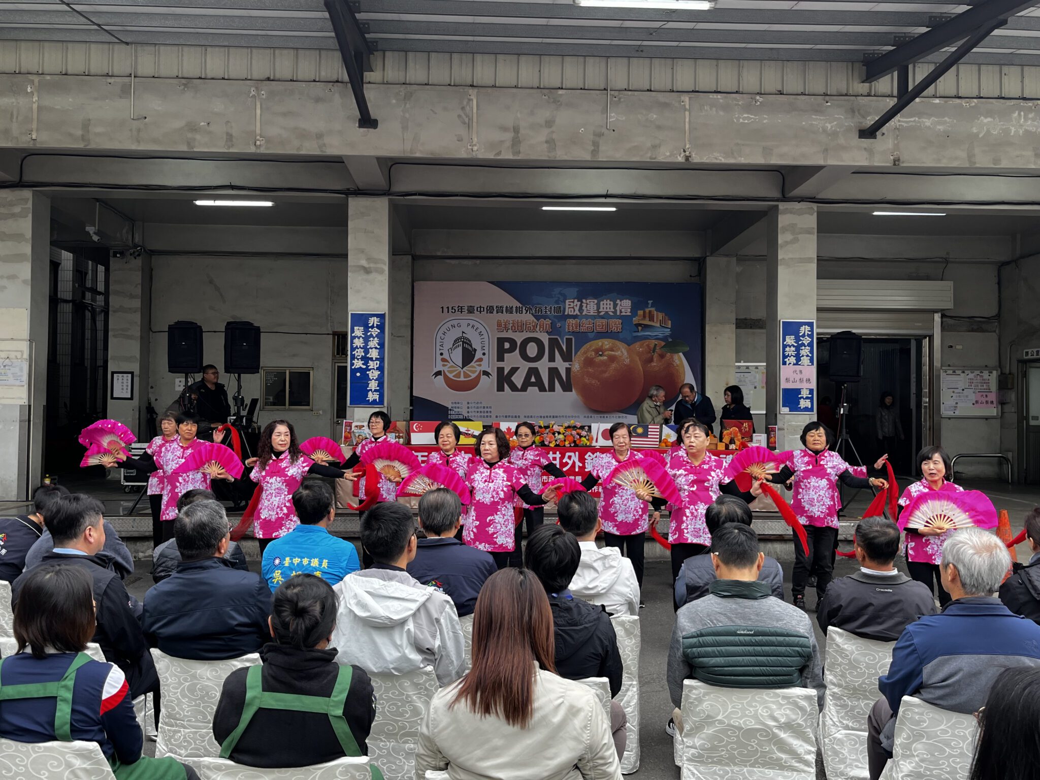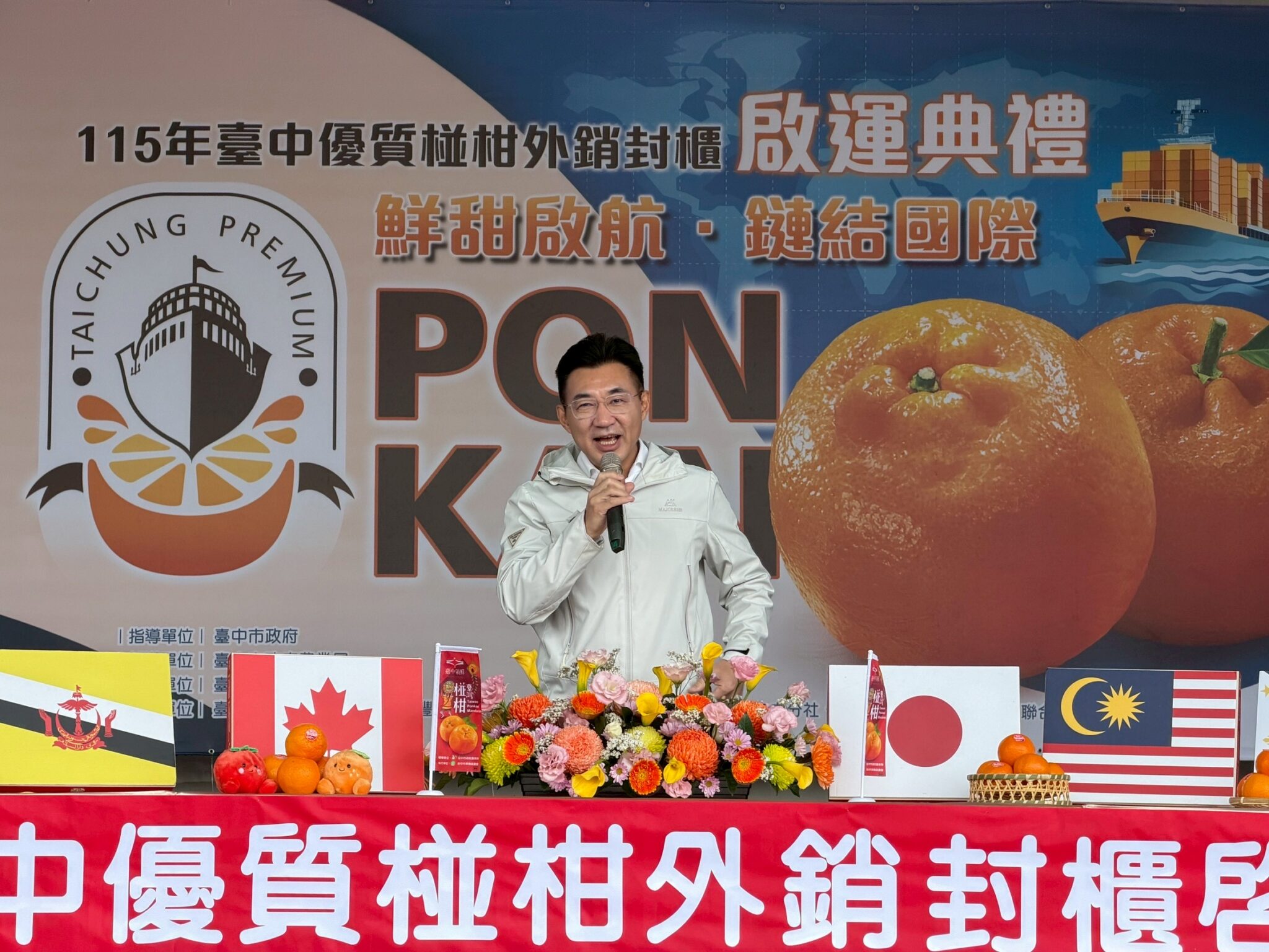今日啟運典禮,包括立法院副院長江啟臣、農業部農業試驗所主任秘書徐煇妃、農業部嘉義農業試驗分所分所長張哲瑋、市議員吳振嘉、市議員蔡成圭服務處代表、農業局代理局長李逸安、台中市農會理事長李煥湘、東勢區農會理事長劉進業、常務監事賴裕銘、總幹事田士欣,以及石岡區農會、豐原區農會與保證責任台灣省青果運銷合作社代表等人到場,共同為台中椪柑外銷啟運加油。