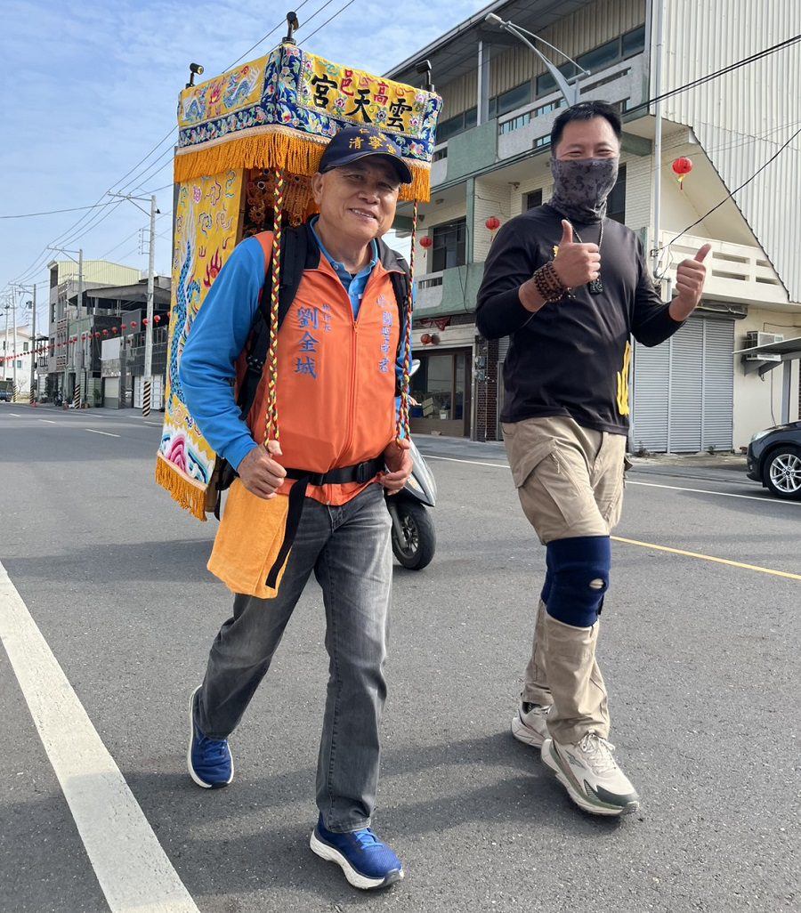 ▲雲天宮副爐主傅俊雲(左)發願揹轎啟動「謝恩行百里」行腳。(圖/高邑雲天宮提供)