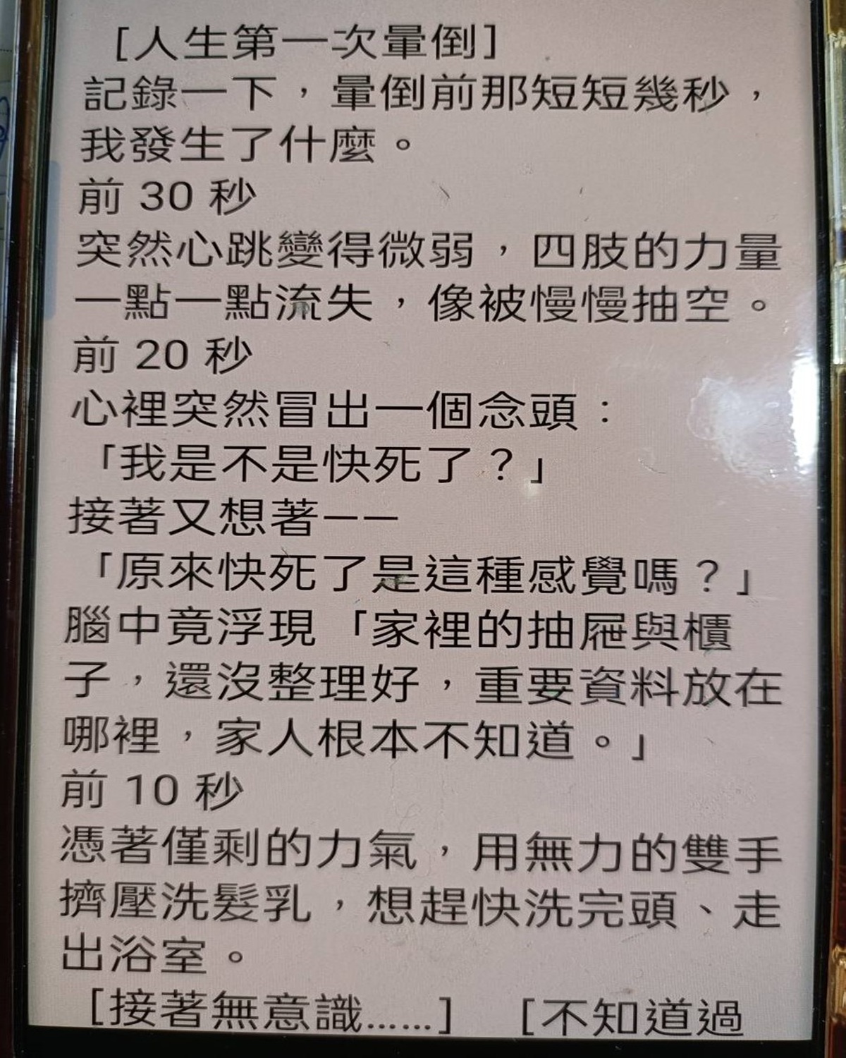 患者表示腦中還想到家裡的東西都還沒整理好,重要的資料放在哪裡,家人根本不知道。剩下最後10秒鐘,覺得快不行了,憑著剩下力量,把頭髮上洗髮乳沖掉,之後就沒有意識了,不知過了多久才醒來,圍上浴巾走出浴間求救,才被緊急送醫。
