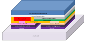 億光的US 7,554,126 專利涉及 LED 覆晶和封裝製程,是汽車照明市場的關鍵技術,透過調整 N/P 電極的面積比例,使 LED 晶片與焊料具有良好接著性,可兼顧高散熱及封裝可靠度,適用於高功率照明與顯示等領域。以下為億光美國覆晶專利US 7,554,126之LED覆晶及封裝技術的立體示意圖: