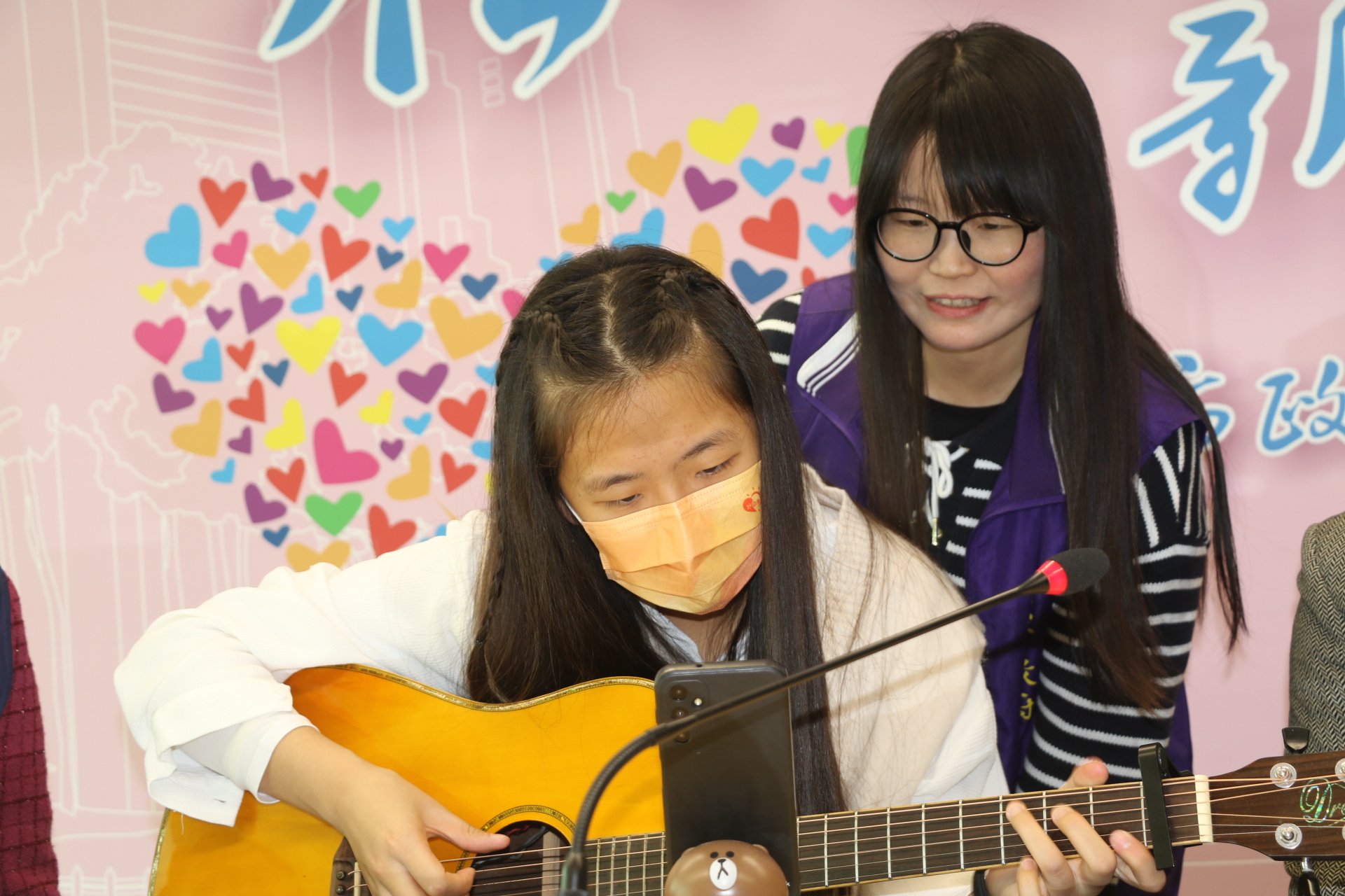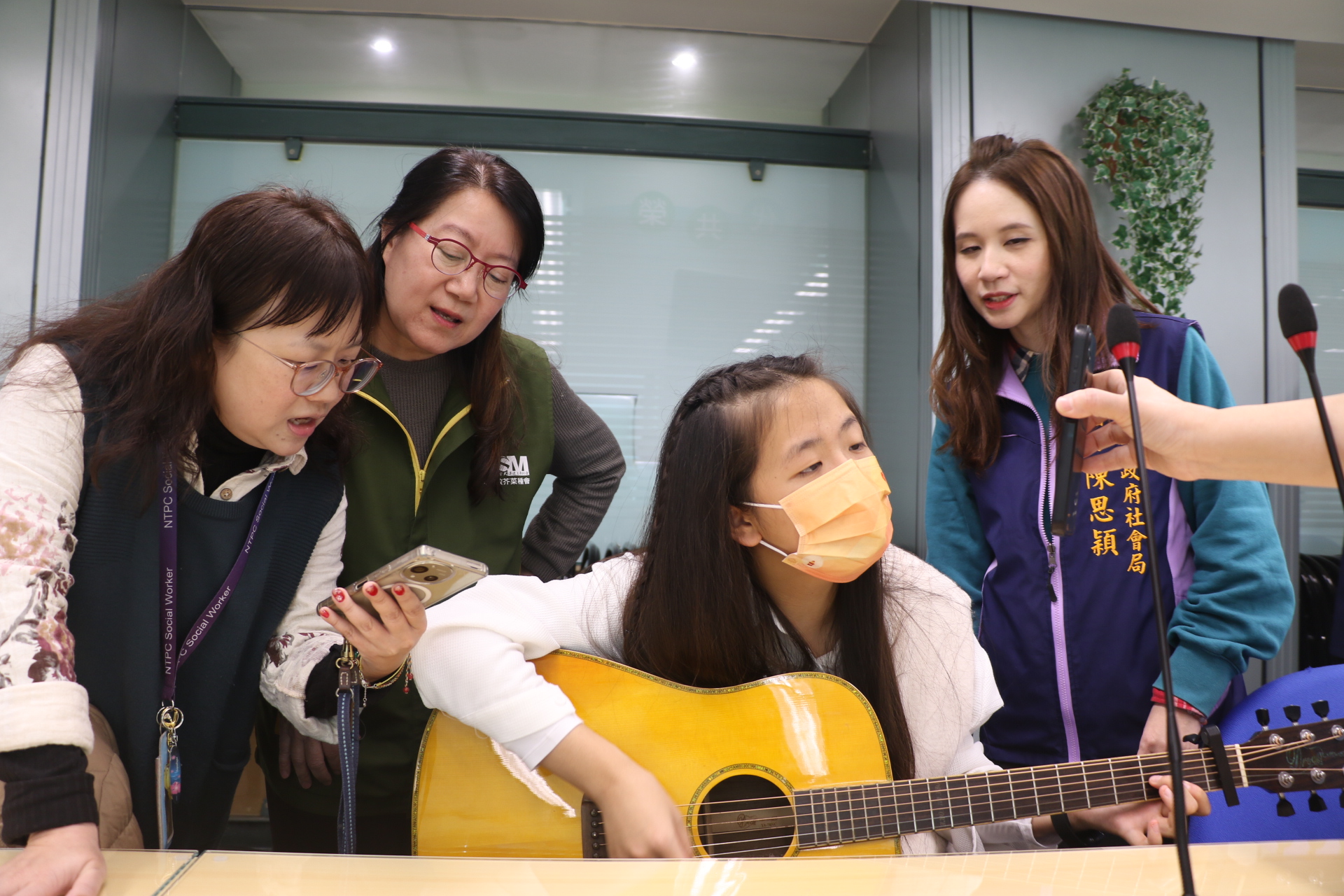 ▲小亭自彈自唱五月天的「知足」和「突然好想你」,希望藉由歌聲表達對所有幫助過的人的感謝。左2為安置機構院長蘇鈺惠。(圖/新北市社會局 提供)