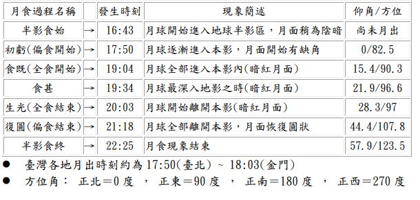 中央氣象署說明,本次月全食全部歷時 4 小時又 35 分鐘。自臺灣時間 3 月 3 日 16 時 43 分起,由「半影食始」揭開序幕、17 時 50 分「初虧」、19 時 04 分「食既」、19 時 34分「食甚」、20 時 03 分「生光」、21 時 18 分「復圓」,最後在 22 時 25 分「半影食終」結束,其間於 19 時 04 分至 20 時 03 分是最精華的全食階段,共計 59 分鐘。臺灣在當日的「半影食始」階段尚未月出,因此將無法見到此階段食相,天文上稱為月出帶食。