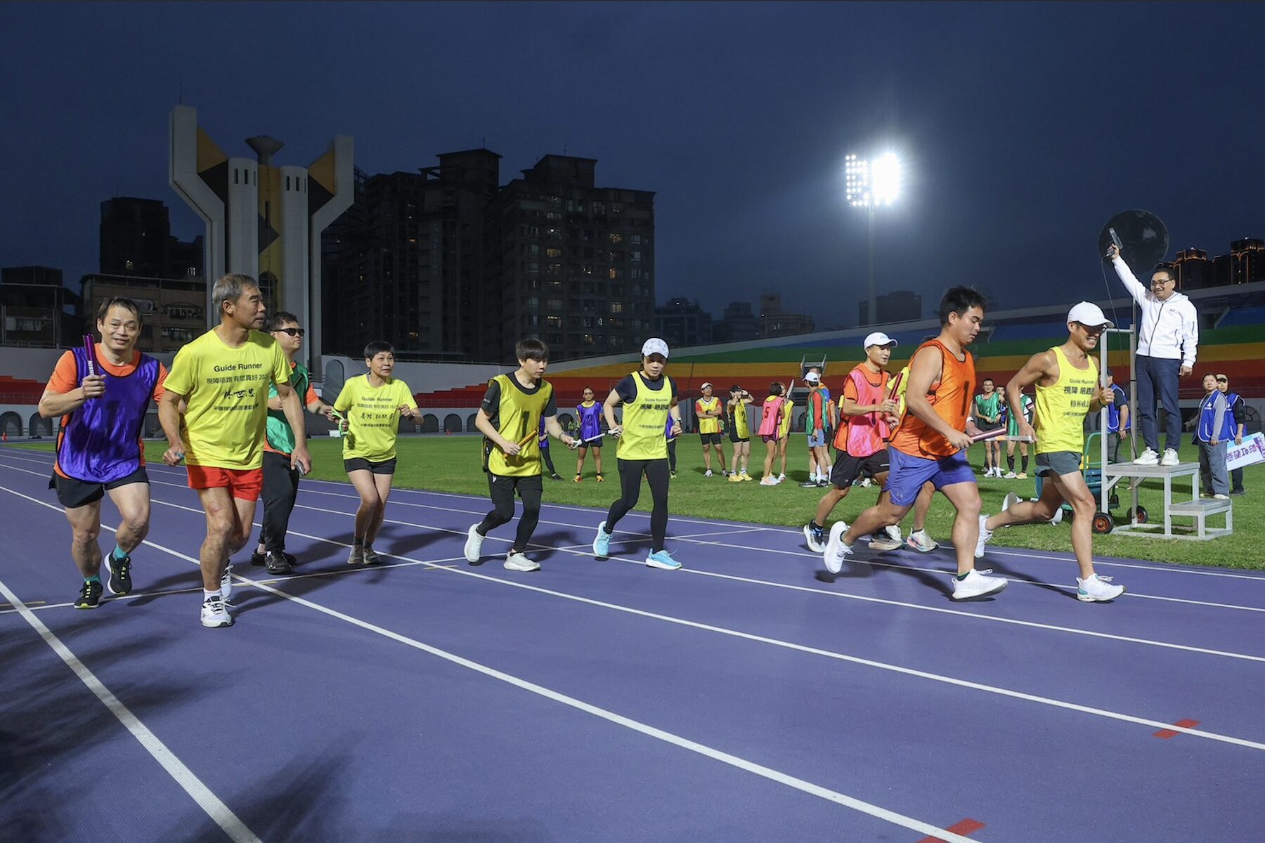 板橋體育場「彩虹看臺」(26)日正式開箱亮相,現場由新北市長侯友宜帶領大家欣賞空拍影像,紫色跑道搭配「紅、橙、黃、綠、藍、紫」看臺,看過就忘不掉的美景即刻收入眼底,開箱後首場接力賽,由侯市長擔任鳴槍手,視障跑者領軍的5支隊伍,一棒接一棒,正式宣告運動平權理念在新北市從口號化為具體行動。