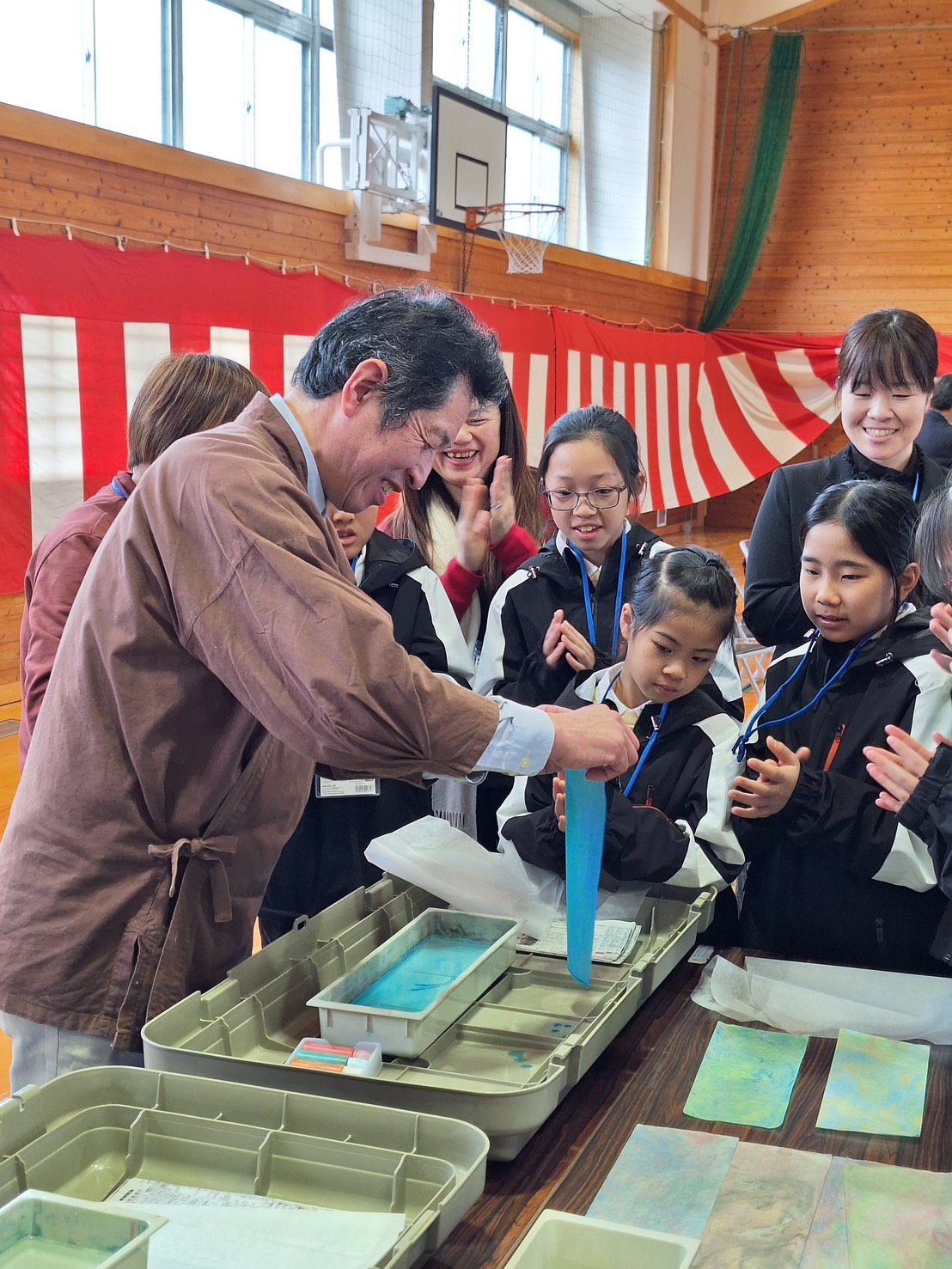 交流活動中,由上鄉小學校長近藤行宣熱情接待花蓮師生,兩地學童透過扯鈴表演、扯鈴體驗教學等活動交流,日本學生也安排體驗具有地方特色的「和紙文化」,與花蓮學童共同進行和紙手作,歡樂互動中認識彼此文化,氣氛熱絡。